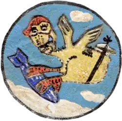- ^ Approved 21 March 1945. Description: On a light blue green disc, edged black, a caricatured "stripped down" duck yellow orange, in flight toward dexter, with red feet, black wing tips, and light magenta eye lids, wearing a brown aviator's helmet, and having a knot tied in the neck, while holding a large black aerial bomb in the feet, and having a small black cannon lighted at the fuse, proper, tied on back with brown string beside six, small, black cannon balls resting on duck's back, all between a white cloud formation in chief and a like formation in base.