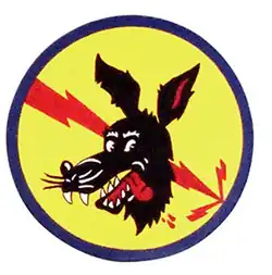 - ^ Approved 18 October 1944. Description: On a yellow disc, wide border blue, a caricatured black wolf's head with white teeth, red tongue, and red mark in eft ear in front of a large red, jagged lightning flash bendwise, striking to sinister base, and having two small red flashes converging chevronwise inverted at the point of impact.