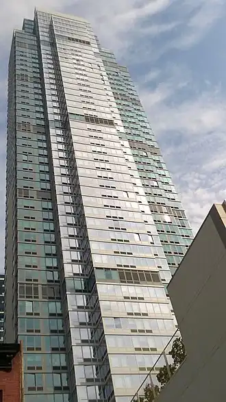 388 Bridge Street is a 590-foot residential high-rise skyscraper in Downtown Brooklyn, within New York City.[2] It contains 378 market rate units,[3] mixed between 234 rentals and 144 condominiums.[4] The building was originally under construction as an all condominium tower before the 2000s real estate crash and subsequent Great Recession. Construction halted from 2008 to 2012 due to the recession, but resumed in 2013.[5]
