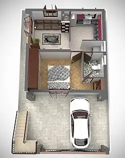 A 3D floor plan is built utilizing 3D rendering software, the same type of software used to create major animated motion pictures. Through complex lighting,[3] staging, camera, and rendering techniques 3D floor plans appear to be real photographs rather than digital representations of the buildings after which they are modeled. It is also the presentation of building floor-plan in an advanced manner, bringing it to real life views.[4]