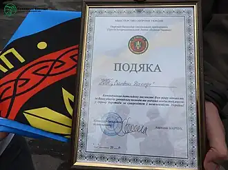 A potential explanation is the unit's focus on reconnaissance, the Ukrainian equivalent of which (розвідка - rozvidka), encompasses both reconnaissance and intelligence.[13] The close association between the two concepts in Ukrainian military doctrine, with GUR's owl as its most prominent symbol, may explain the owl on 3rd Battalion's badge.