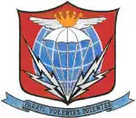 - ^ Approved 20 June 1957. Description: Gules, a sphere azure with longitude and latitude lines argent; the sphere issuing from four lightning bolts radiating upward from base of the last [color mentioned]; a parachute, in pale, between the four bolts, two and two, argent, gores outlined of the second [color mentioned], all superimposed over the sphere; over all in chief an antique crown or, winged argent.