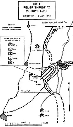 A second relief attempt began on December 5, driving into the center of 5th Guards Corps until by December 10 the relieving force held a salient with its eastern tip between 13-20km from the Velikiye Luki garrison. It attempted to renew its push on December 11 but by now the Corps had been reinforced with the 19th Guards Rifle Division. On the 14th the 291st Infantry managed to retake Gromovo but was forced out again the next day by the 9th Guards. During most of this period the front facing the 46th Guards was relatively quiet and by the 16th a lull fell over the battlefield as the LIX Army Corps paused to regroup. This was completed by December 19 when a third effort began with an artillery preparation and attack that mostly hit the 9th and 19th Guards. The 46th Guards reported at 1700 hours that the German forces it faced had remained inactive while the 9th Guards limited the advance to 900m at the most. The attacks went on until December 24 when the relief force went over to the defensive. The final relief attempt began on January 4, 1943 and despite the earlier arrival of the 360th Rifle Division and 100th Rifle Brigade, Beloborodov was compelled to also reinforce his defense with two regiments of the 46th Guards, one to the 9th Guards and one to the 360th. The next day elements of LIX Corps wedged forward to within 1,000m of the Velikiye Luki-Novosokolniki road but on January 6, despite the commitment of the 331st Infantry and 707th Security Divisions, the German force was held. It made no further progress through to January 12 when it suspended its attacks due to exhaustion about 3km from the city.[9]