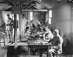 The South Midland Division mobilised on the outbreak of World War I in August 1914, and went to its war stations round Chelmsford in Essex.[6] Shortly after mobilisation, the TF was invited to volunteer for overseas service and the formation of a reserve or 2nd Line unit was authorised for each unit where 60 per cent or more of the men had volunteered. The titles of these 2nd Line units were distinguished by a '2/' prefix, including the 2/1st South Midland Divisional Signal Company in the 61st (2nd South Midland) Division.[1][3][7][8][9]