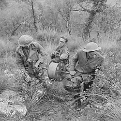 The division sailed on 16 October and 11th Infantry Brigade (including its HQ and signals) carried out the first 'Torch' landing near Algiers at 01.00 on 8 November. The rest of the division followed on 12 November, and it took part in the drive eastwards towards Tunisia. Communications were maintained by radio and by requisitioning the local civilian telephone system. By 24 November the division was fighting Axis troops around Medjez el Bab and Tebourba. The enemy counter-attacked strongly at Tebourba Gap, and First Army was unable to take Tunis in 1942.[3][37][40][41]