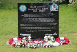 A permanent memorial, situated near the old fuel dump on RAF Eye, was dedicated to the 490th Bombardment Group on 29 May 2016, in front of families of 490th veterans, current serving USAF personnel, and guest of honor, 490th veteran, Si Spiegel.[11] Also present at the unveiling were the family’s of 490th veterans, the local parish priest who blessed the memorial and Niles Schilder who read the poem High flight by John Gillespie Magee Jr.