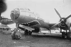 ![]() 869th Bomb Squadron B-29 42-24592 "Dauntless Dotty". Shown is Major Robert Morgan, pilot of the aircraft. On 24 November 1944, he led the first mission of the XXI Bomber Command to bomb Japan, 110 aircraft of the 73rd Bomb Wing to Tokyo, with wing commander Brig. Gen. Emmett O'Donnell, Jr. as co-pilot. His B-29 was nicknamed Dauntless Dotty, after his third wife, Dorothy Johnson Morgan | |