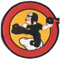 - ^ Approved 15 May 1943. Description: Over and through a yellow disc, wide border red, a caricatured figure in khaki flight suit, brown shoes and helmet, white goggles, balancing on right foot on white cloud formation in base, and throwing a round, black fire bomb with the right hand.