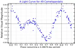 Walter K. Bonsack et al. discovered that 49 Camelopardalis is a variable star, in 1974.[11] It is classified as an Alpha2 Canum Venaticorum type variable and its brightness varies from visual magnitude +6.43 down to +6.48 with a rotationally-modulated period of 4.29 days.[4]