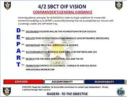 The 4th Brigade, 2nd Infantry Division ("Raiders") is an inactive Stryker Brigade Combat Team (SBCT) of the United States Army. The brigade was activated at Fort Lewis, Washington on 1 June 2006 by reflagging the 2nd Stryker Cavalry Regiment. The 4th Stryker Brigade was the last U.S. Army combat brigade to serve in support of Operation Iraqi Freedom.[1][2] The brigade deployed three times in support of the War on Terror, to Iraq from 2007–2008 and from 2009–2010, and to Afghanistan from 2012–2013 before deactivating in March 2014.