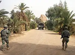 Soldiers of 4th Stryker Brigade Combat Team, 2nd Infantry Division, approach the ziggurat at Aqar Quf