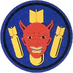- ^ Approved 9 December 1943. Description: On an ultramarine blue disc, border ultramarine blue, piped black, three yellow aerial bombs, one to dexter, one to sinister, pointing to center base point, larger one in center in pale, surmounted by the head and face of a grinning red devil affronte, trimmed black and yellow.