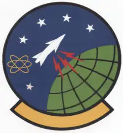 - ^ Approved 20 April 1976. Description: A blue disc edged with a narrow black border on which is a green demi-globe issuing from sinister base with axis bendwise grid-lined black below an arced pattern of five white five-pointed stars and a yellow atomic symbol, above the globe a stylized white missile ascending bend sinisterwise emitting three red lightning flashes surmounting the upper portion of the globe. Attached below the disc a blank yellow scroll edged black. Significance: The missile represents the unit's function, and the atomic symbol its nuclear technology. The three lightning bolts symbolize the missile's speed, power, and strike capability, and the grid and sky are emblematic of the unit's global capability. The five stars represent the unit's World War II participation in five campaigns.