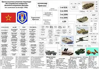 Between 1982 and June 1988, the 56th Brigade was stationed in the area of the city of Gardez, conducting combat operations throughout Afghanistan: Bagram, Mazar-i-Sharif, Khanabad, Panjshir, Logar, Alikheil (Paktia). In 1984, the brigade was awarded the Challenge Red Banner for the successful completion of combat missions.[8] The brigade was reequipped with the BMP-2 infantry fighting vehicle in 1985. On 5 April 1985, it was awarded the Order of the Patriotic War 1st class. The authorized strength of the 56th Guards Air Assault Brigade as of December 1, 1986 was 2,452 people (261 officers, 109 warrant officers, 416 sergeants, 1,666 soldiers).[9]