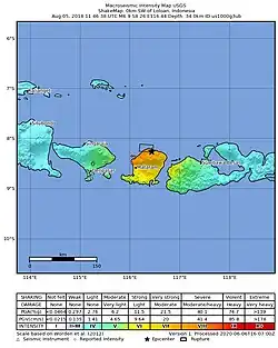 The earthquake occurred on 19:46 local time, at a depth of 34.0 km (21.1 mi) (USGS)[12] or 15.0 km (9.3 mi) (BMKG).[15] Shaking was felt as far away as Sumbawa in the east[16] and Trenggalek Regency in the west.[17][18] Shaking was also felt in Pacitan Regency, East Java.[19] The Indonesian Agency for Meteorology, Climatology and Geophysics (BMKG) stated that the epicentre of the earthquake was located inland, on the northeastern slopes of Mount Rinjani at 8°22′S 116°29′E / 8.37°S 116.48°E. It initially measured the earthquake's magnitude at Mw 6.8, before revising it to 7.0.[15][20] The United States Geological Survey initially measured the earthquake at Mw 7.0, before revising it down to 6.9. It placed the epicenter at 8°17′13″S 116°27′04″E / 8.287°S 116.451°E, somewhat north of the BMKG estimate.[12][21]