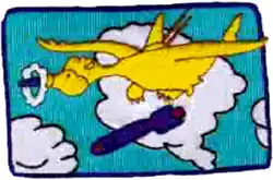 - ^ Approved 18 August 1944. Description: On a light turquoise blue rectaangle, long axis horizontal, corners rounded, bordered dark blue, a caricatured yellow orange "Swoose" in flight, trimmed brown, blowing a blue cannon shell from the beak, encircled by white smoke ring, and having a plexiglass turret on the back with two guns firing, proper, while dropping a large dark blue aerial bomb with nose and fins dark red, all in front of a large white cloud formation to dexter and sinister base.