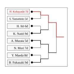 The female professional seed was determined by a single-game playoff between Tomomi Kai 2-crown (Women's ōi and Kurashiki Tōka) and Manao Kagawa (Women's ōshō), which was won by Kagawa.[3] Brackets from two of the preliminary tournaments are shown below.