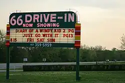 66 Drive-In is a historic drive-in theater national historic district located on U.S. Route 66 in Carthage, Jasper County, Missouri. The theater opened on September 22, 1949, four years before the first local television stations signed on in the Joplin-Springfield area.[2][3] In an era before widespread adoption of transistors and before the invention of integrated circuits, car radios were not standard equipment in all vehicles. The few radios installed in vehicles were of vacuum tube design and power-hungry by modern standards. A series of poles in the car park of the nine-acre site were therefore deployed to hold loudspeakers so that viewers could hear the movie.