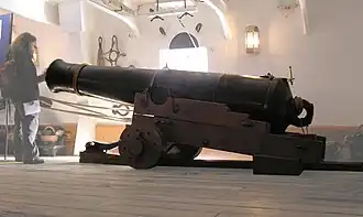 On land a minimum crew of nine men (usually commanded by a non-commissioned officer) was required to fire the gun, which was normally mounted on a traversing gun carriage.[10] On board a ship the gun crew could be doubled to 18 men who needed to traverse the gun carriage by hand, using hand spikes and rope tackles.[11] The extra crew was because sailing ships usually only fired their cannon from one side of the deck. In the unlikely event of both sides being in action at once, nine men would be detached to man the gun opposite.[11] In both cases the gun was elevated using wooden wedges driven under the breech of the barrel by brute force.[11][12] It was aimed using an advanced hexagonal sighting mechanism marked with the elevation on one face and the gun's range (according to different weights of cartridge charges) on the other five faces.[18][19]