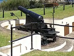 On land the 68-pounder was used extensively in British coastal defences constructed during the 1850s - notably at forts like Gomer and Elson defending Portsmouth, and Forts Victoria, Albert and Freshwater Redoubt defending the Needles Passage.[25] The 1859 Royal Commission envisaged arming the numerous new forts they proposed with the 68-pounder cannon and costed for them accordingly.[6][7] The introduction of the Armstrong gun initially led many to think that weapon would be used instead, but whilst the forts were being built, the Armstrong gun's weaknesses were exposed and the military reverted to using muzzle loaded weapons.[6] However, the advantages of rifling and the Armstrong's wrought iron construction were retained, leading to a new design of artillery piece – rifled muzzle loaders.[6]