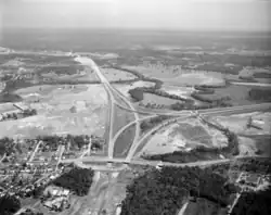 The 75/24 Split, along with both Interstates, were part of the original stretches of Interstate Highways authorized by the Federal-Aid Highway Act of 1956. On July 26, 1959, the contract to construct the interchange, along with the stretch of I-75 extending to the Georgia state line, was awarded to Oman Construction of Nashville.[7][8] The interchange was dedicated on May 31, 1961, in a ceremony officiated by state highway commissioner D. W. Moulton, Chattanooga Mayor P. R. Olgiati, and Hamilton County Judge (now County Mayor) Chester Frost. The interchange cost US$3.32 million (equivalent to about $35M in 2024), and was one of the first sections of both I-75 and I-24 to be completed in Tennessee.[9] Referred to at the time as the Spring Creek Interchange, the interchange was constructed in a simple directional-T configuration, with ramps to and from I-24 connecting to I-75 northbound from the left. When first opened, I-75 north of and I-24 west of the interchange were not yet complete; traffic heading in the direction of I-24 westbound had to use temporary connections to Spring Creek Road, and I-75 northbound traffic had to turn around at South Chickamauga Creek. In late October 1962, I-24 was extended approximately 2 miles (3.2 km) to Belvoir Avenue,[10] and on December 7, 1962, the 2.1-mile (3.4 km) section of I-75 between the Split and SR 320 (East Brainerd Road) opened, which also opened the remaining ramps on the interchange.[11]