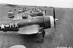The group was reassigned to Duxford airfield in April 1943 and reequipped with Republic P-47 Thunderbolts.[1] Aircraft of the group were identified by a black/white chequerboard pattern.