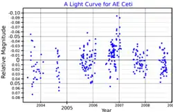 7 Ceti is a single,[11] variable star in the equatorial constellation of Cetus. It has the variable star designation AE Ceti.[1] The star is visible to the naked eye with a baseline apparent visual magnitude of 4.44.[3] Based upon an annual parallax shift of only 7.3 mas,[2] it is located roughly 450 light years away. It is moving closer to the Sun with a heliocentric radial velocity of −23 km/s.[7] Eggen (1965) listed it as a probable member of the Wolf 630 group of co-moving stars.[12]