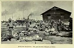 By now the decision had been made to abandon the Suvla sector, and on 15 December the battalion embarked for Mudros, the rearguard of two officers and 45 other ranks arriving on 24 December. On 27 December 7th Gloucesters sailed once more for Helles, landing on V Beach on 27 December, the left half of the battalion relieving 1/4th Bn East Lancashire Regiment at Fusilier Bluff and the right half taking over the support line. The last Turkish attacks at Helles were repulsed on 7 January 1916, when the commanding officer of 7th North Staffords was killed and Major Harry Bull of 7th Gloucesters had to take over temporary command of both battalions. On the night of 8/9 January Helles was also evacuated, with 7th Gloucesters sailing from W Beach aboard the troopship HMS Ermine back to Mudros.[7][9][20]
