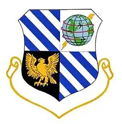 1. ^ Approved 12 January 1956. Description: First and fourth quarters bendy of eight, azure and argent; the second quarter argent, over a lightning bolt in bend sinister, a sphere all proper, two aircraft volant sable with a trailing stream of power gules encircling the sphere; third quarter sable an eagle rising, wings elevated and displayed or.