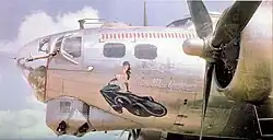 6. ^ Aircraft is Boeing B-17G-85-BO Flying Fortress, serial 43-38400, Alice Blue Gown. After the war this plane returned to the United States and was put into storage at Kingman Army Air Field on 15 December 1945. It was sold for scrap in July 1946. Baugher, Joe (14 May 2023). "1943 USAF Serial Numbers". Joe Baugher. Retrieved 1 August 2023. Photograph taken at RAF Eye. This aircraft completed 67 missions.