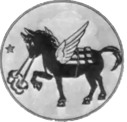 - ^ Approved 8 September 1945. Description: On a light turquoise blue disc, border white, edged black, a caricatured, red pack horse facing to dexter, winged white, snorting flames from the nostrils, and having three, brown aerial bombs strapped on back by a brown and yellow band, all in front of a large white cloud formation; in dexter fess a yellow-orange five-point star, edged black.