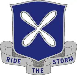 A Silver color metal and enamel device 1+1⁄4 inches (3.2 cm) in height overall consisting of a shield blazoned: Azure, a cross pendal saltirewise Argent. Attached below and to the sides of the shield a Silver tripartite scroll inscribed "RIDE THE STORM" in Blue letters.