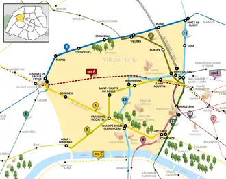 Most French fashion luxury brands have their main store in 8th arrondissement, Avenue Montaigne or Rue du Faubourg Saint-Honoré, both in the Champs-Élysées Avenue shopping district.[2] As of 2019, the 8th arrondissement had a population of 35,655.