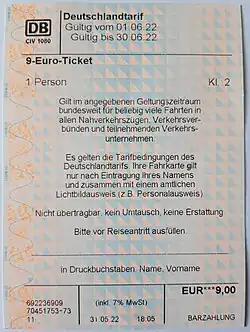 The 9-Euro-Ticket (German pronunciation: [ˌnɔʏ̯n ˈɔʏ̯ʁo ˈtɪkət]) was a German scheme through which passengers could travel for 9 euros (€) per month on local and regional transport in all of Germany. The tickets were valid for June, July, or August 2022. The offer aimed at reducing energy use amid the 2021–2022 global energy crisis.[1][2] Another aim was to ease the cost of living crisis.[3]