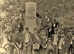 Col. Joseph Hill Sinex (center, hand on monument) with former members of the 91st Pennsylvania at the regiment's new monument at the highest point on Little Round Top, Gettysburg National Military Park, c. 1889.