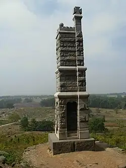 One of the more frequently visited sites at the Gettysburg National Military Park is the castellated granite tower which commemorates the service of the 91st Pennsylvania Volunteers during the Battle of Gettysburg. Erected on September 12, 1889, at the highest point of Little Round Top, "this monument appears to hang over the western edge of the hillside, just off the asphalt path that winds throughout the summit," according to park officials, and documents the exact position defended by the regiment from July 2–3, 1863. Created by the Ryegate Granite Works in Ryegate, Vermont, the monument is composed of a series of five-foot-square blocks topped by a finial emblazoned with the 5th U.S. Army Corps' Maltese cross. Situated atop a square base that is seven feet high, the entire structure stands 25.6 feet tall, and is flanked by one-foot-square granite markers with flat tops and mitred edges. (Note: These edges were mitred later as part of a repair effort to fix the damaged corners on the flanking markers.) Polished, inscribed panels convey key details about the regiment's service.[84]
