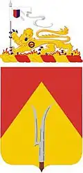 • Crest: The crest commemorates the unit's combat action in World War II and subsequent service in Germany with the United States Constabulary. The lion is taken from the arms of Normandy where the organization initially contacted the enemy. The four flames of fire refer to the unit's four decorations. The scarlet and blue shield, taken from the arms of Bastogne, and the white color of the banner, alluding to snow, refers to the organization's participation in the rescue of Bastogne in heavy snow fall during the Ardennes Campaign. The banner is of a type frequently used in Europe in the Middle Ages. The annulet and lightning flash, simulating the insignia of the United States Constabulary, allude to the unit's postwar service in Germany.[6]
