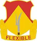 • Symbolism: The shield is divided scarlet and yellow, scarlet being the Artillery color and yellow the color of Artillery guidon markings. The charge shown is known as a guisarme, a weapon used in ancient times to reach the enemy behind the defense. It symbolizes the operations of the organization.