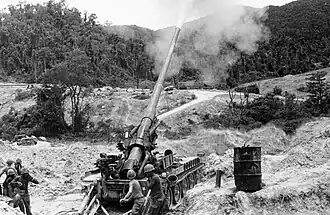 M107 self-propelled gun of "A" Battery, 2nd Battalion, 94th Artillery fires in support of Marines in the A Shau valley, 1 August 1967