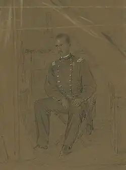31 years old. Enrolled on May 3, 1861, at New York City, New York, for two years' service; mustered into service as captain of Company G of the 9th New York Volunteer Infantry Regiment on May 4, 1861; absent, sick, from December 18, 1861, to January 14, 1862; promoted to major on February 14, 1862; wounded in action on April 19, 1862, at Camden, North Carolina; on a leave of absence in June 1862; commanding the regiment from June 26, 1862; temporarily assigned to command of the 89th New York Volunteer Infantry Regiment in September 1862; detailed as the post provost marshal of Suffolk, Virginia, from February 10, 1863; mustered out of service with the regiment on May 20, 1863, at New York City, New York. (Commissioned as a captain on July 4, 1861, with rank from May 13th, 1861, original; as major on February 24, 1862, with rank from February 14, 1862, vice Major E.A. Kimball was promoted)[15] Appointed as colonel of the 9th New York Veteran Volunteer Infantry Regiment on May 29, 1863, for three years' service; seriously wounded in the thigh by a piece of lead pipe on July 17 (15th), 1863, at First Avenue and Nineteenth Streets in New York City, New York, during the Draft Riots, he was rescued by two young ladies who took him and two others to their home, he later escaped with their help to the home of a nearby surgeon by wearing civilian clothes; mustered out of service on October 14, 1863, at New York City, New York. Enrolled and was mustered into service as lieutenant colonel of the 17th New York Veteran Volunteer Infantry Regiment on October 17, 1863, at Albany, New York, for three years' service; granted a ten-day leave of absence on account of physical disability on May 9, 1864; honorably discharged on May 10, 1864, to accept an appointment. (Commissioned as lieutenant colonel on December 29, 1863, with rank from October 14th, 1863, original)[16] Appointed as captain of the 4th Company of the 2nd Battalion, Veteran Reserve Corps, to date from May 3, 1864; brevetted to the rank of brigadier general of United States Volunteers on November 2, 1865, for "gallant and meritorious services during the War of the Rebellion;" resigned his commission on April 12, 1866.[17]