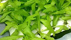 A-Choy (also known as AA Choy, Sword Choy, or You Mai Cai in English) is a leafy green vegetable that is a variety of lettuce, scientifically classified under Lactuca sativa, a species in the Asteraceae family.[1] Native to Southern Taiwan,[2] the A-Choy is a staple of Taiwanese cuisine that is well known for its crisp stalks, tender leaves, and slightly sweet, mild flavor. The stem portion of the A-Choy is known as the celtuce or stem lettuce, and is often used as a vegetable in its own right.[3]