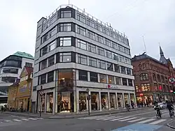 The company's former headquarters at the corner of Østergade and Bremerholm is a seven-story Modernist building.[4] A tall pillar with a statue of Diana trying to catch a small fur animal runs along the full height of the building and a few meters higher on its Strøget side.[5]