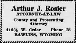 Rosier left Montana in September 1911 and moved to Rawlins, Wyoming. He was admitted to the Wyoming State Bar on October 30, 1911, and opened a law office in Rawlins. During this period, he represented several regional banks, including the First State Bank of Baggs and the Stock Growers Bank in Saratoga.[1] In 1914, Rosier was elected prosecuting attorney for Carbon County,[15] and was re-elected in 1916 and 1918.[1][16] According to writer Ichabod Sargent Bartlett, Rosier was well-regarded in the role of prosecuting attorney: