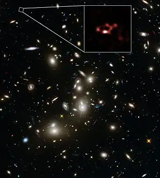 A2744_YD4 is a very distant young galaxy. This galaxy has first been identified as a possible distant galaxy in 2015 using the Hubble Space Telescope. This detection was made possible because this galaxy lies behind the massive galaxy cluster Abell 2744. In 2017, ALMA observed it and detected a small quantity of dust (the most distant stardust to date) and the first signature of Oxygen emitting light only 600 million years after the Big Bang.[3]