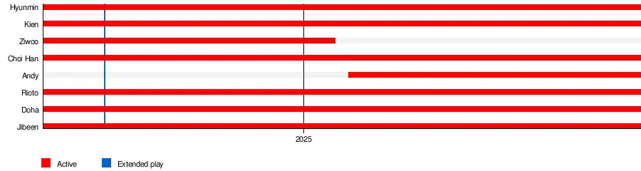 ![]() ARrC in January 2025 L–R: Rioto, Ziwoo (former), Choi Han, Hyunmin, Kien, Jibeen, Doha | |
