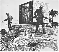On the occasion in question, Rivers and his partner, Chandra Aiyar, conduct two other clients to the past. One of them, Courtney James (based on Jack Parsons[8]), is a vain, arrogant and spoiled playboy; the other, August Holtzinger, is a small, timid man recently come into wealth (time safaris are not cheap). Before the journey, they testfire some guns on the firing range to settle on weapons for each of them. Holtzinger's small size makes him incapable of effectively handling the elephant gun which Rivers recommends (the recoil knocks him over) and, against his better judgment, Rivers lets Holtzinger travel on the safari with a lighter-caliber weapon.