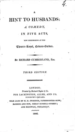A Hint to Husbands is an 1806 comedy play by the British dramatist Richard Cumberland which was first performed at Covent Garden Theatre.[1] The prologue was written by James Bland Burgess. The play was not a success and lasted for only five nights. The original cast included Charles Kemble as Lord Transit, Henry Erskine Johnston as Sir Charles Le Brun, Alexander Pope as Heartright, John Fawcett as Fairford, John Brunton as George Trever, Charles Farley as Pliant, John Emery as Codicil, William Blanchard as Dogherty and Julia Glover as Lady Le Brun.