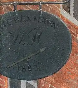Marstrand has incorporated his own signature in the motif by placing his initials and the date on a shop sign in the upper left corner of the painting. It is accompanied by two crossed brushes.