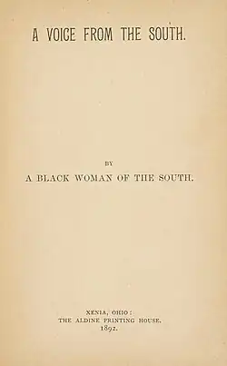 A Voice from the South: By a Black Woman of the South is the first book by American author, educator, and activist Anna J. Cooper. First published in 1892, the book is widely viewed as one of the first articulations of Black feminism.[1] The book is divided into two parts, "Soprano Obligato" and "Tutti Ad Libitum". Each section contains four individual essays.[2] This book led to the term "Cooperian" being coined when speaking about Anna J. Cooper.[3] It is considered one of the first, full-length Black feminist texts.[4]