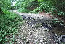 One of its particularities is the unnamed, left tributary, only a few hundred meters long, at the southernmost point of the Johannes-Gelhaus path at Reelsen, where one can observe the creek well. As a Tufa source and under the influence of moss the creek forms small Calcareous sinter. During the summer the creek dries out.